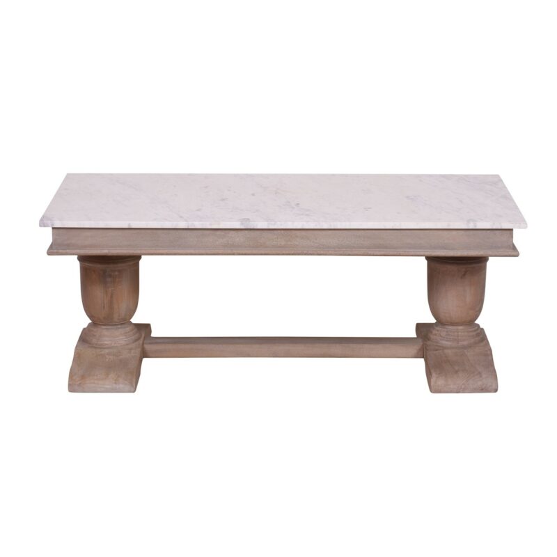 Elegant and stately, the Adelaide coffee table features a solid mango wood base in a salvage finish, with a beautiful white marble top.