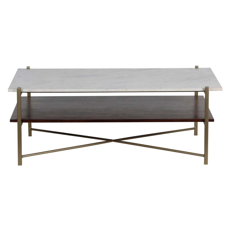 Materials merge to create this living room collection that offers practical storage along with modern design. Crafted from Mango wood in a chestnut finish, iron legs in gold and a Banswara Marble top.