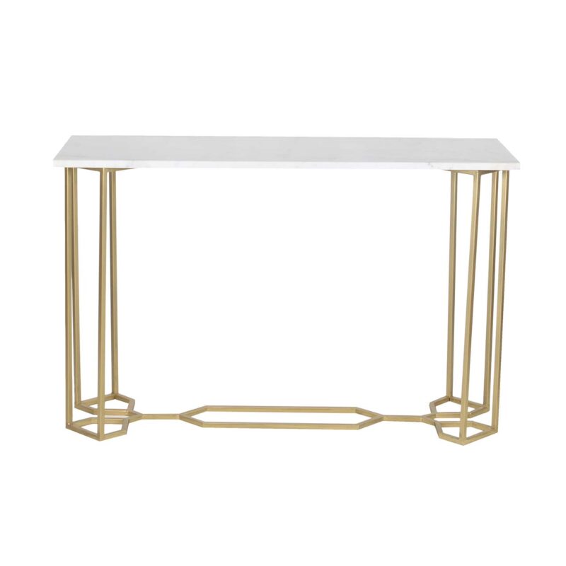 Sleek and classic the Queens Bridge Console table features a shapely iron base in a gold finish with a Marble top.