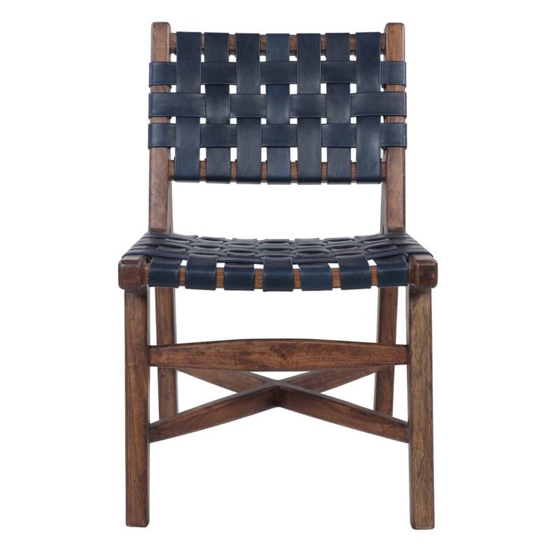 Woven leather with a solid Mango wood frame create a robust chair that features on its own or around a dining table.